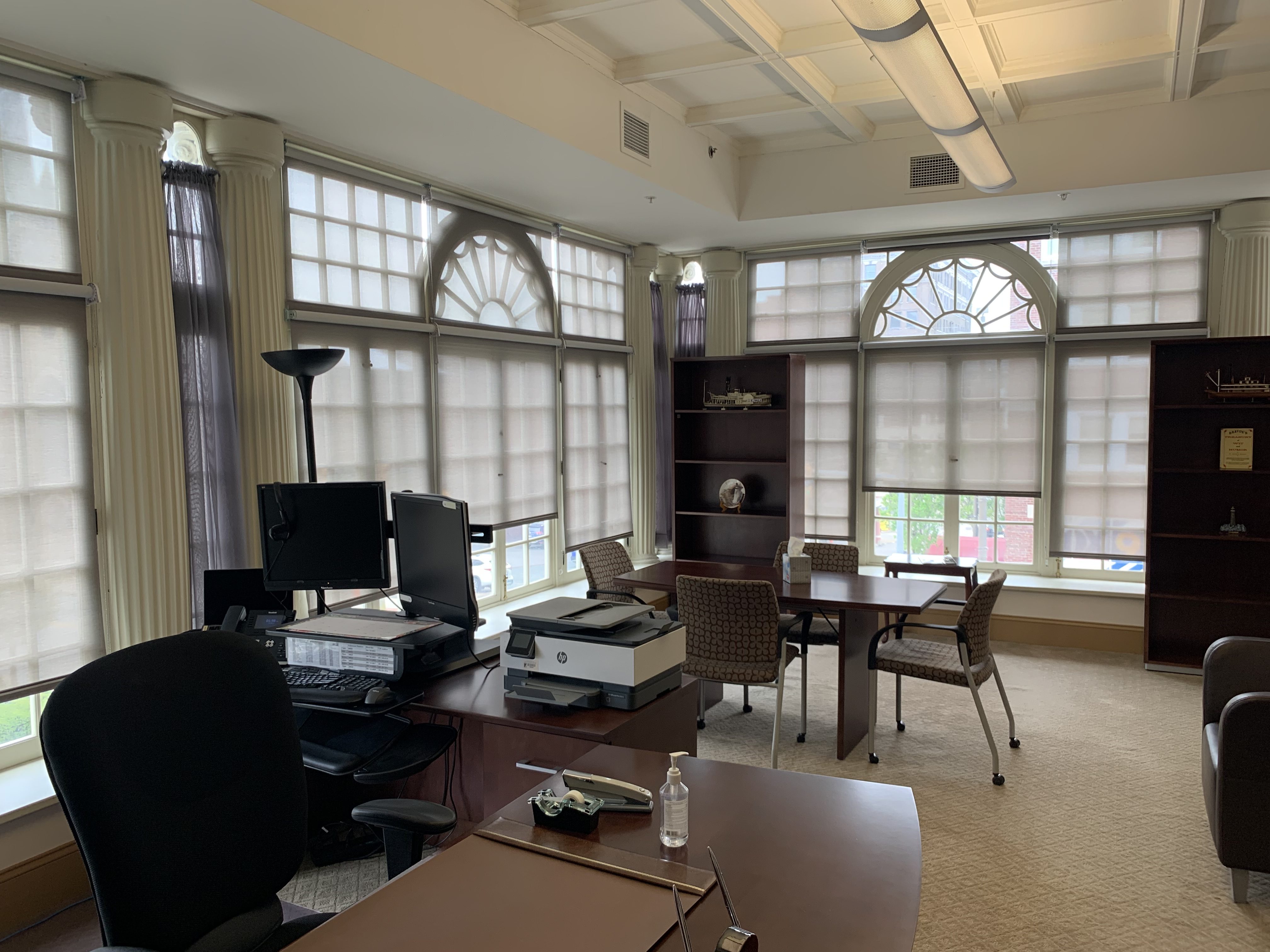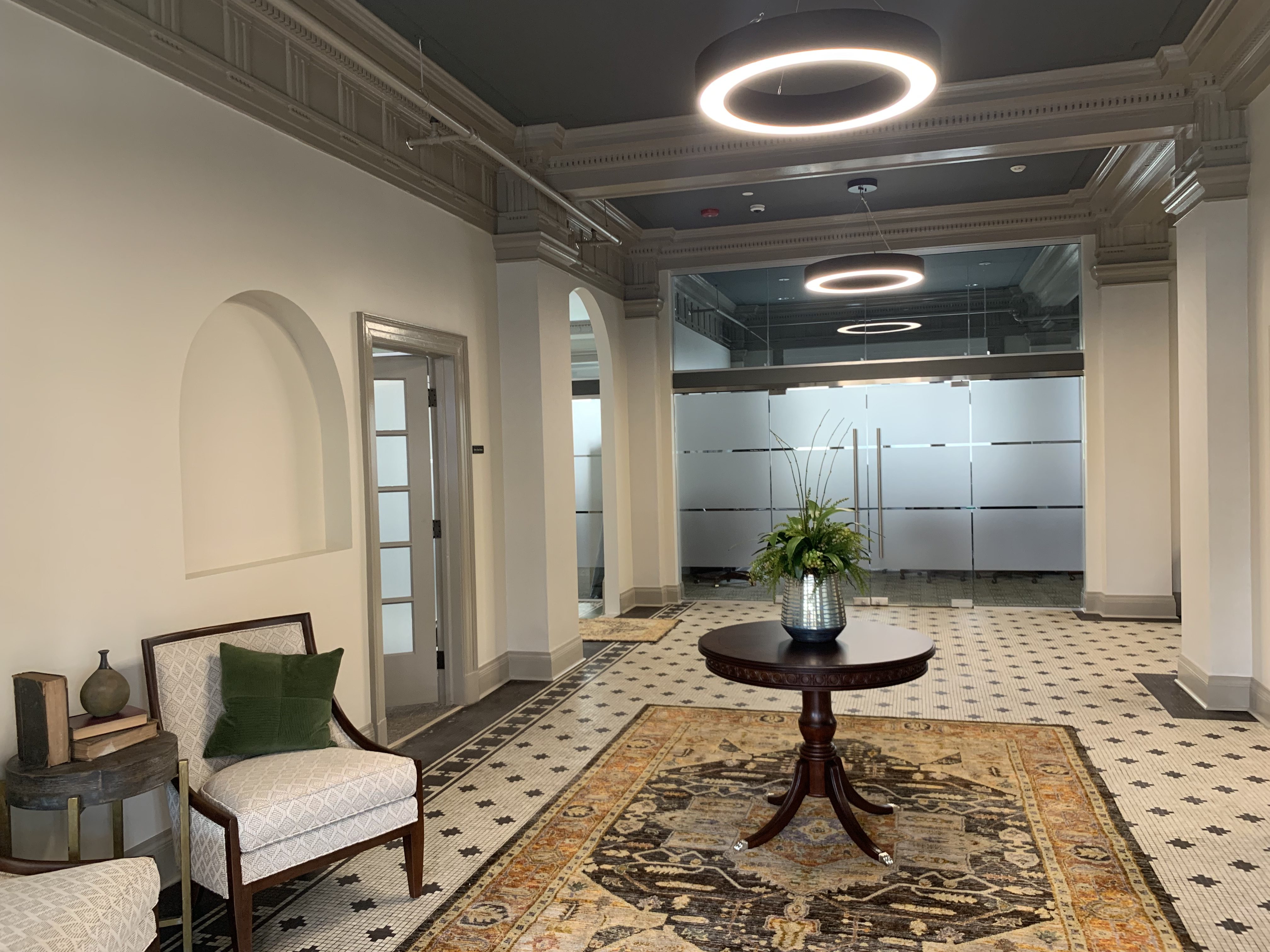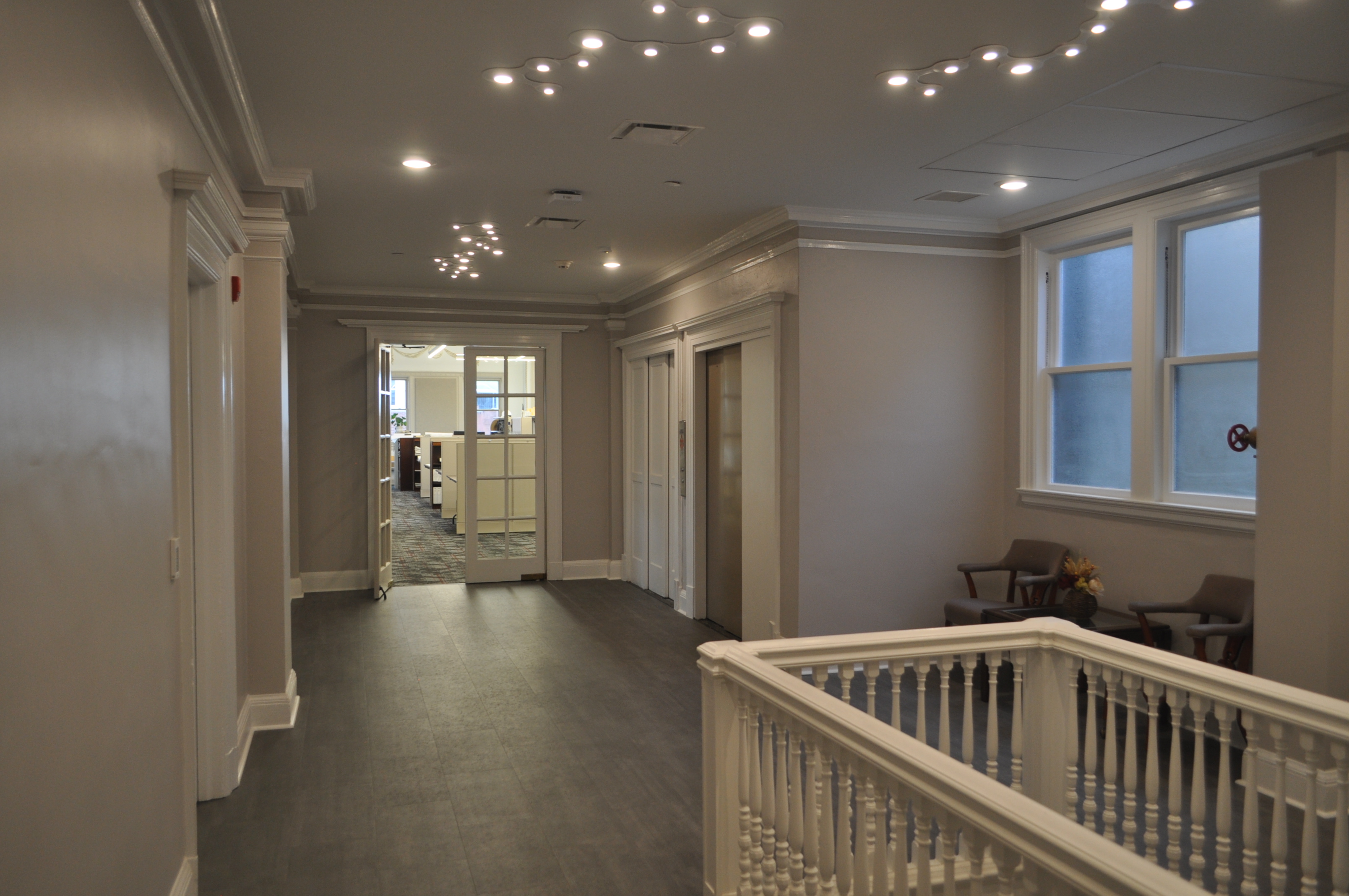 Because the 4 story building had been in disrepair for many years, these build-out renovations include upgrades required to get the building up to current codes and standards, ADA lobby entrances, windows rehab/replacement, masonry repairs, porch restoration, new HVAC, electrical service, plumbing, sprinkler & fire alarm systems, roof replacement, new elevators, storm & sewage line separation, sidewalks, and much more. The tenant space renovations included office build-outs, work areas, conference rooms, restrooms, kitchenettes / break rooms, lobbies, data systems, and storage, among other scope.