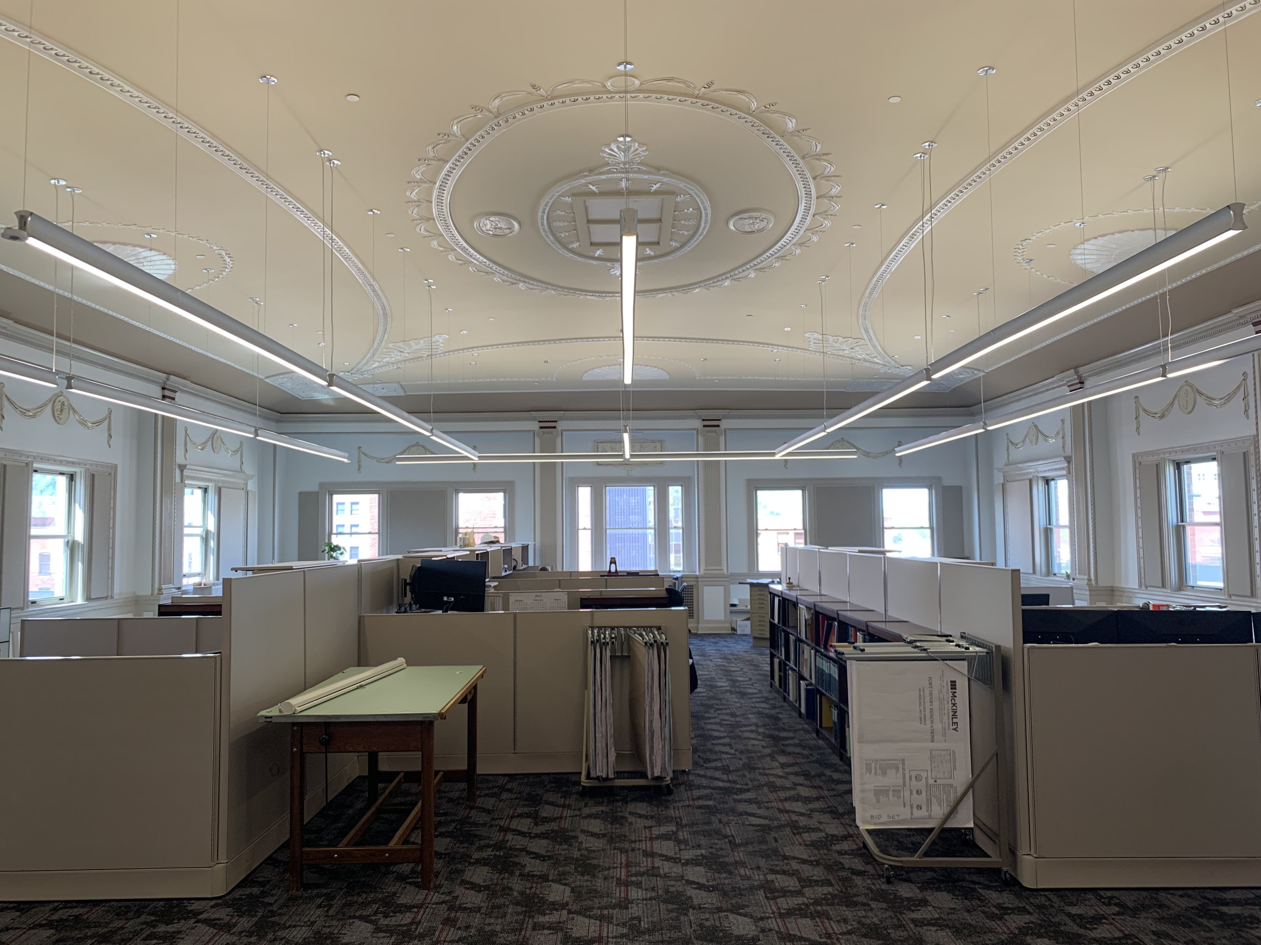 We also converted the 4th floor formal ballroom into a work area, and a surprise that was uncovered was that hidden above a suspended drop ceiling was the original 1920 domed plaster ceiling with intricate detail including seashells, flowers, angels, medallions, sphinx, and bas-relief. We restored this ceiling to showcase its original magnificent ambiance.