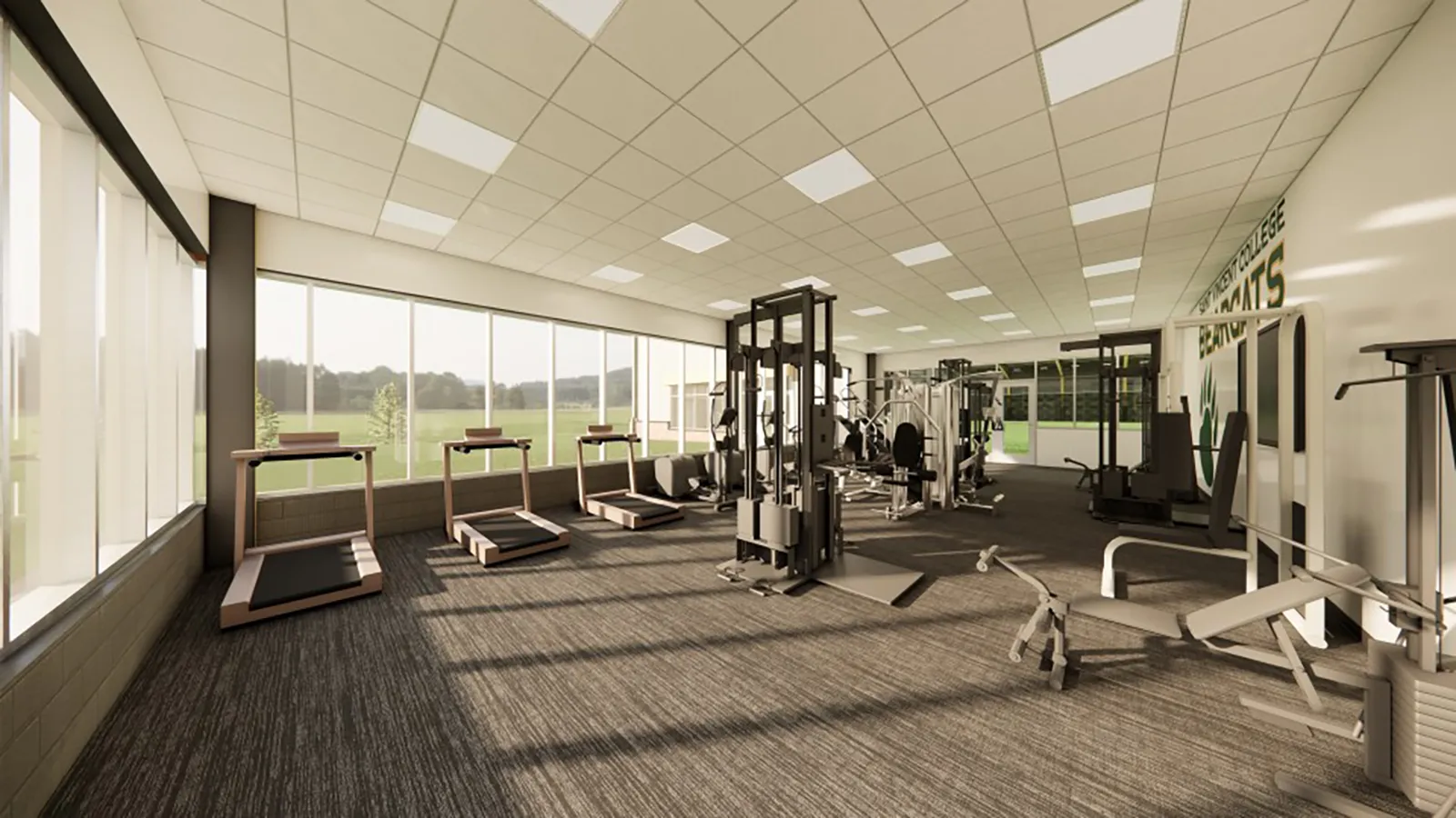 Spanning 72,000 square feet in its initial phase, the center will significantly expand the College’s offerings for fitness, intramural sports, and varsity athletic training. It will include a fully equipped fitness room with cardio and circuit training equipment, a recreational indoor track, and multipurpose studios for yoga, Pilates, and group fitness classes. Student-athletes will benefit from a dedicated athletic training center for medical therapy and treatment, as well as modern locker rooms and a 70-yard indoor turf football field.