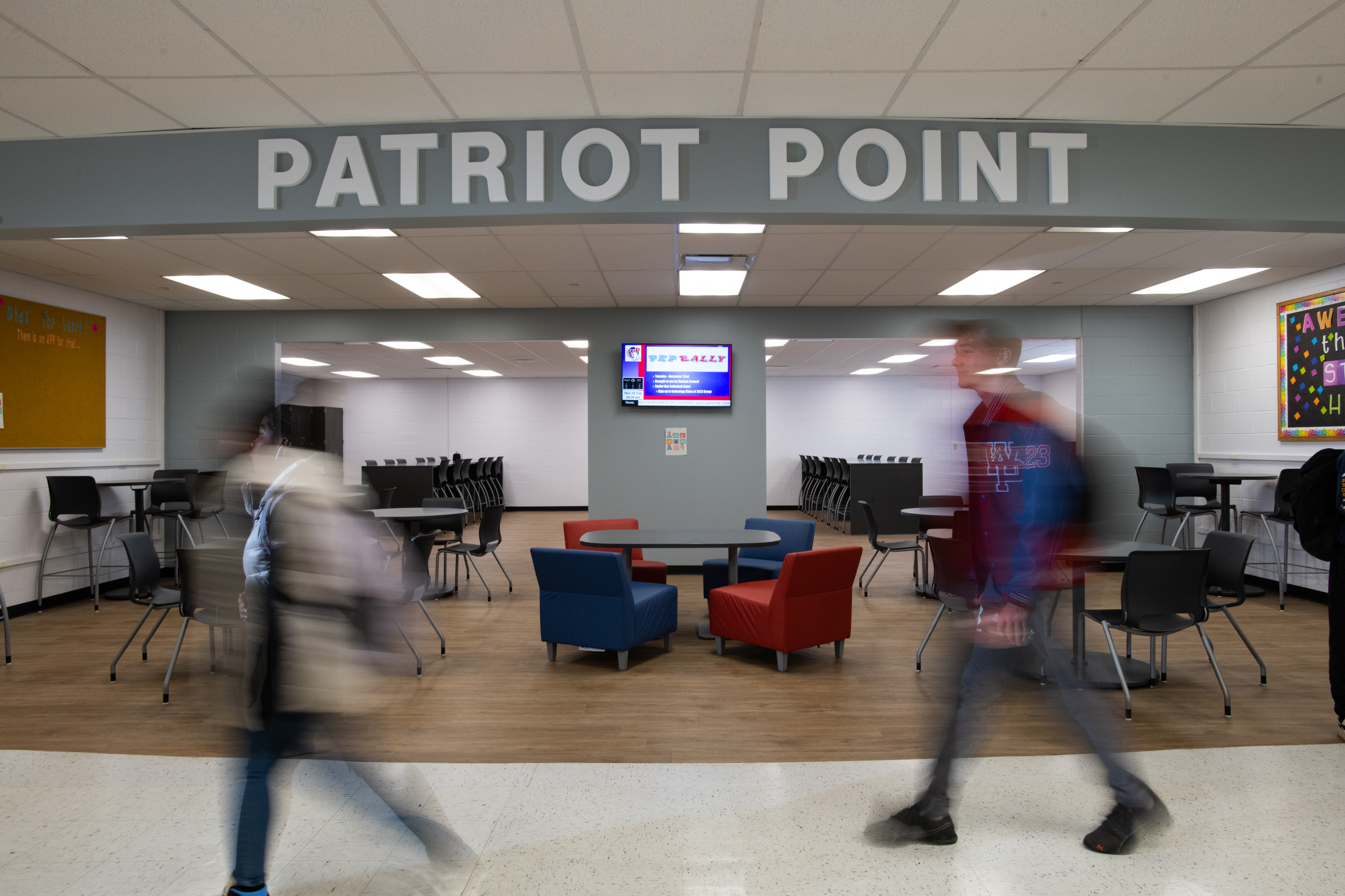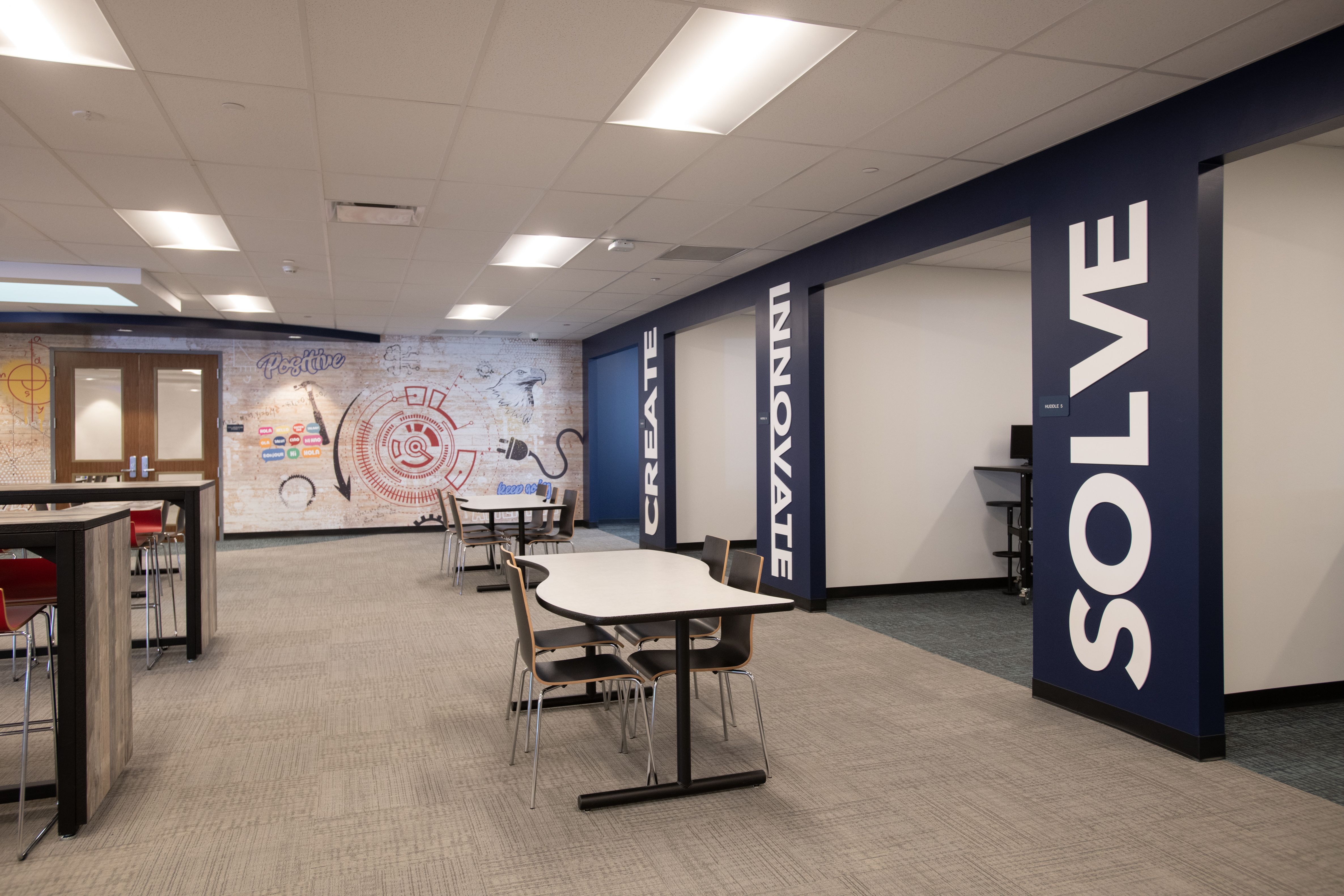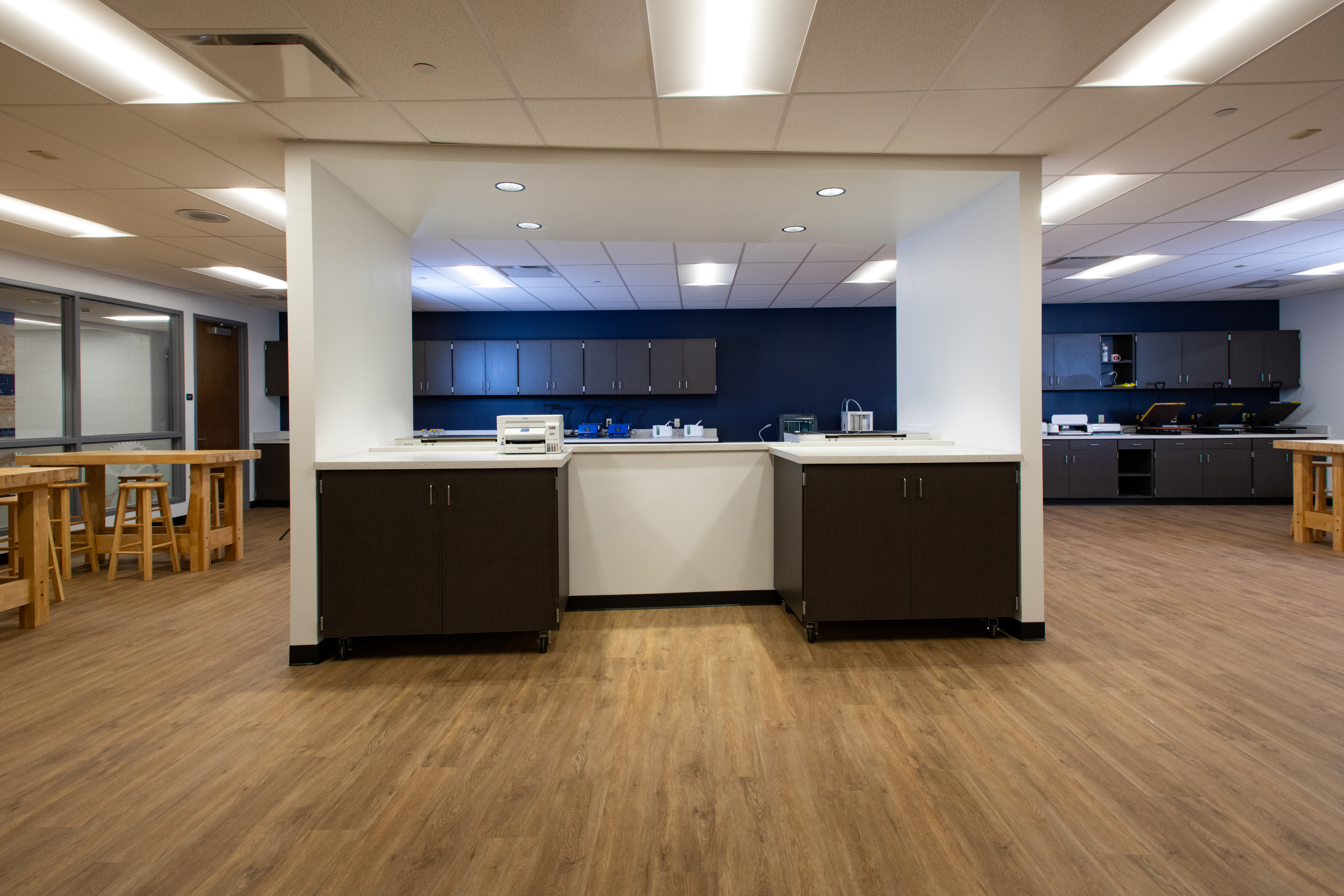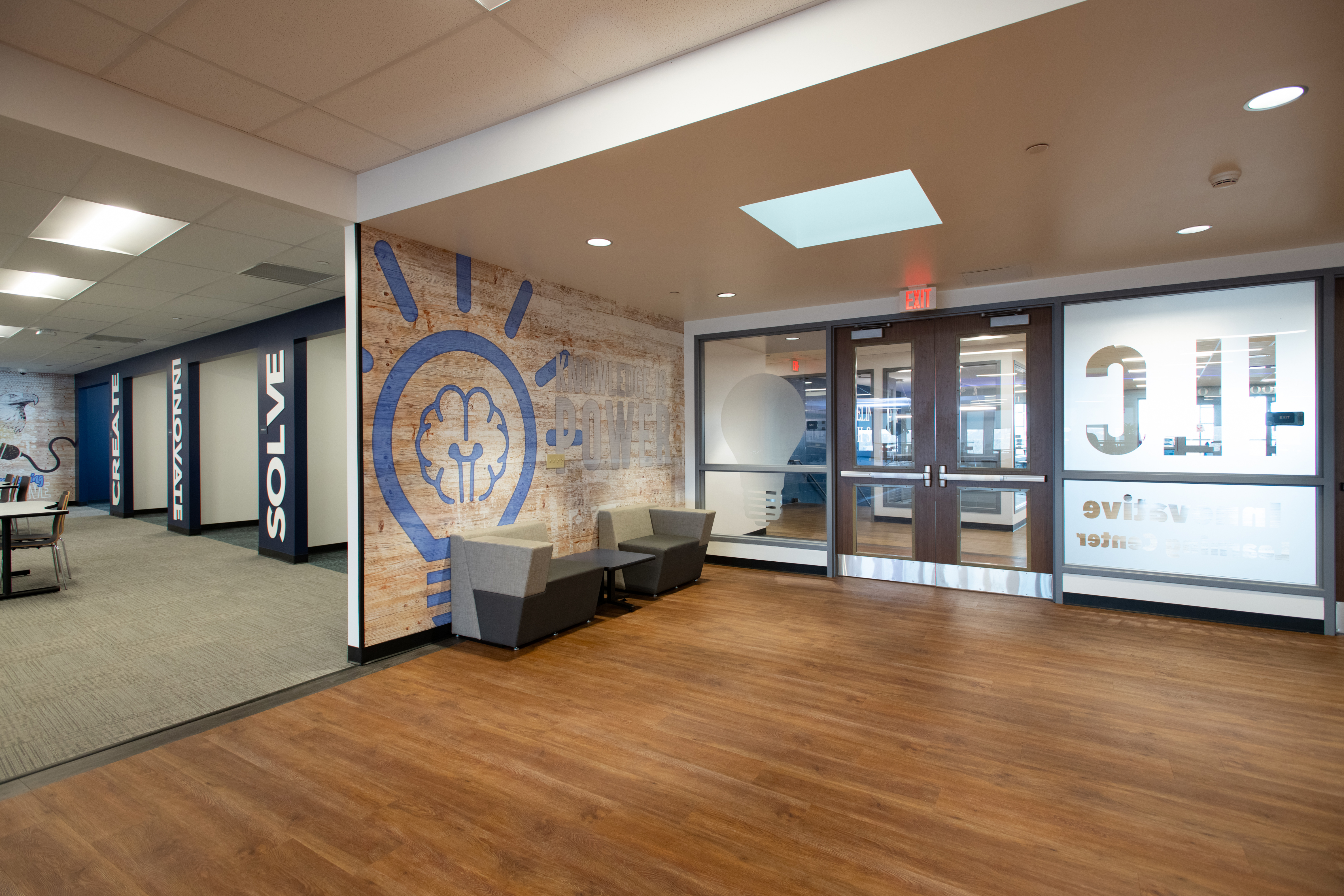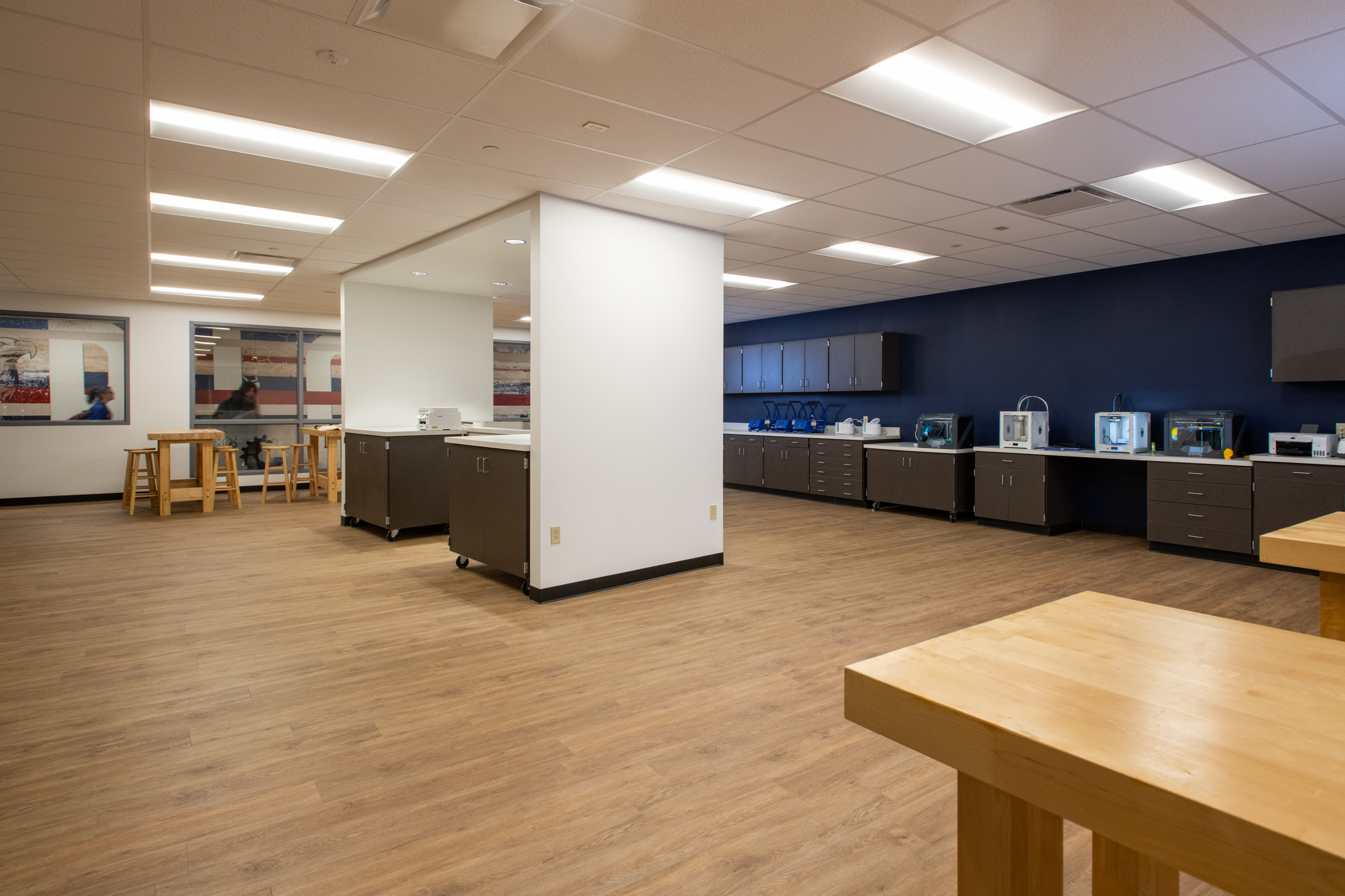 An area of significant improvement was the original Library/Media Center; the renovated 13,000 SF area is now their Innovative Learning Center, where students are encouraged to be creative, collaborate, brainstorm, and create. It’s hands-on, immersive learning. This area includes an updated Maker Space, STEM Lab & Flexible / Group Learning Center that creates various small scale break out “Huddle Spaces” to encourage and facilitate independent and small group study, 3D printers, Crickets, laser printers, heat presses, whiteboard Kiva wall room for brainstorming and collaboration, multimedia greenroom, Presentation Space, and a student engagement conference room. There are VR capabilities with it, too, where students can walk around, visit different sites, and go on trips to other places.