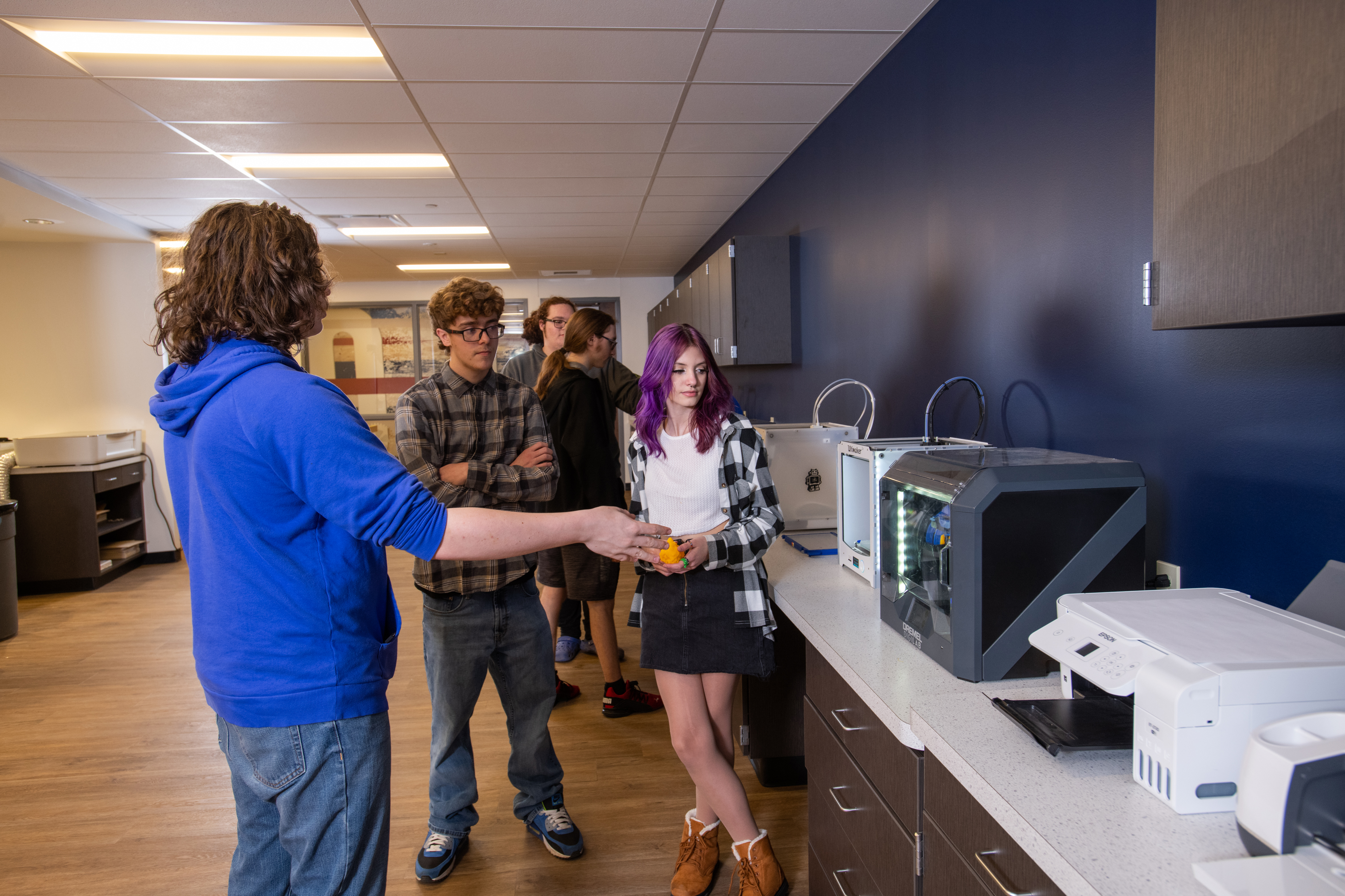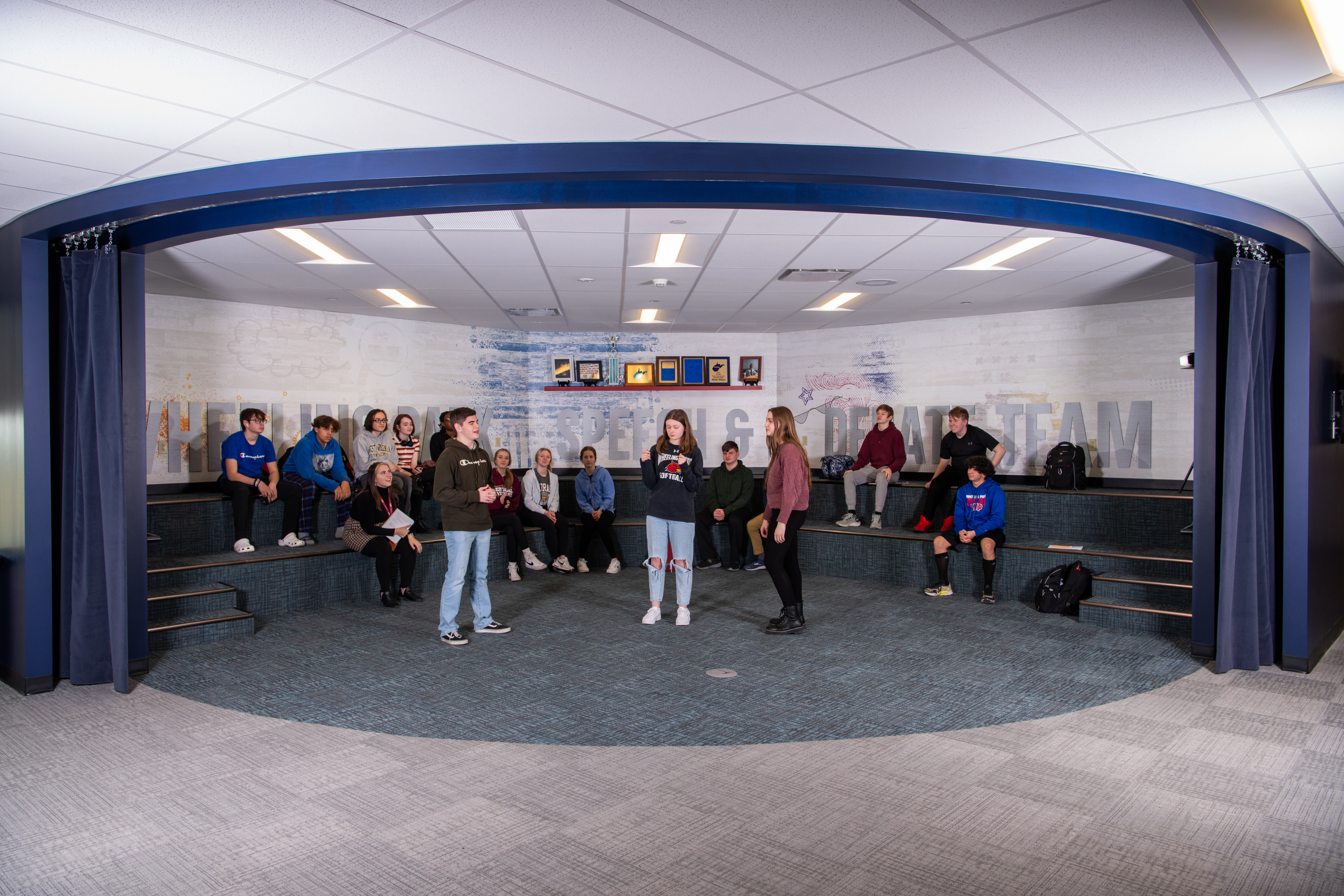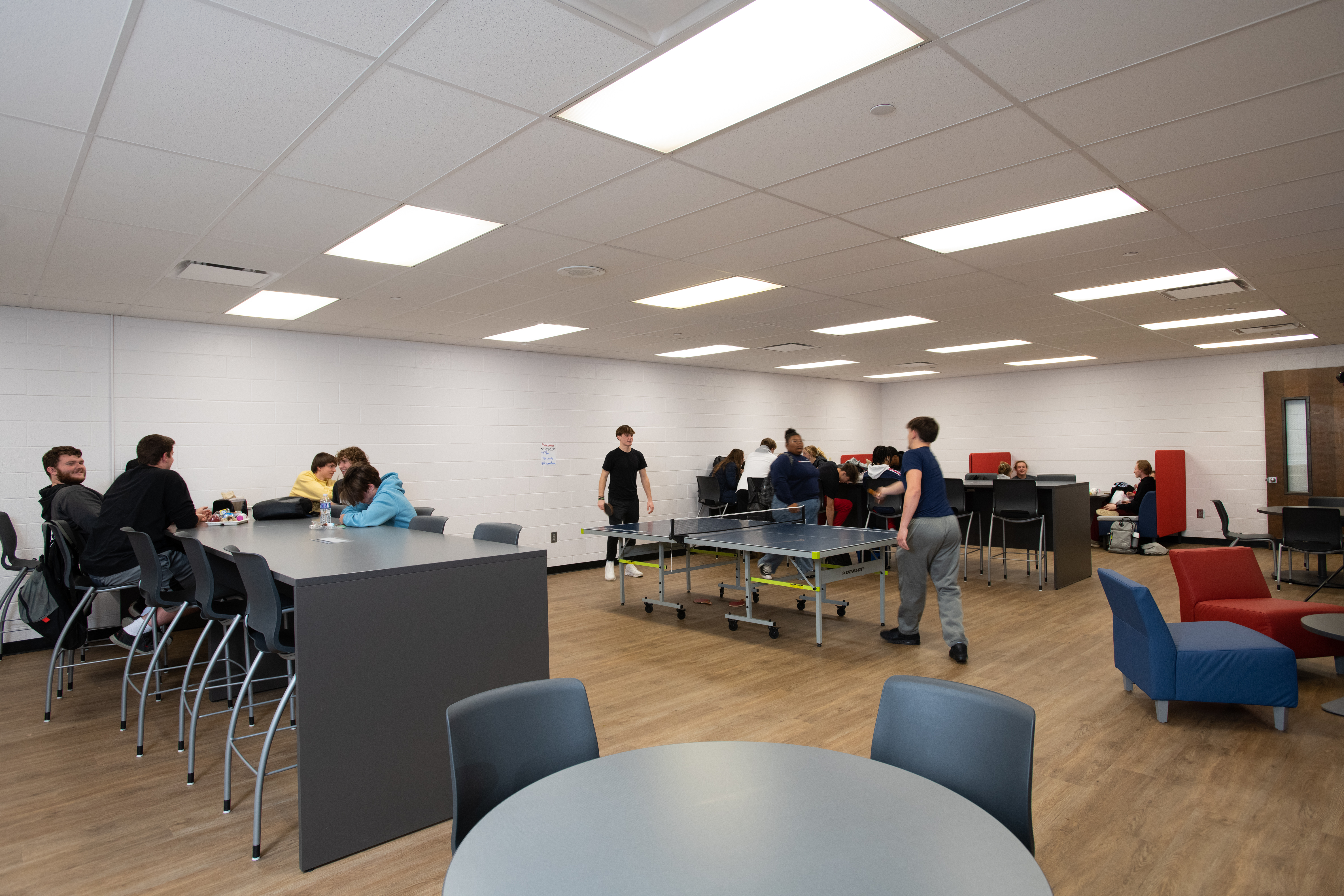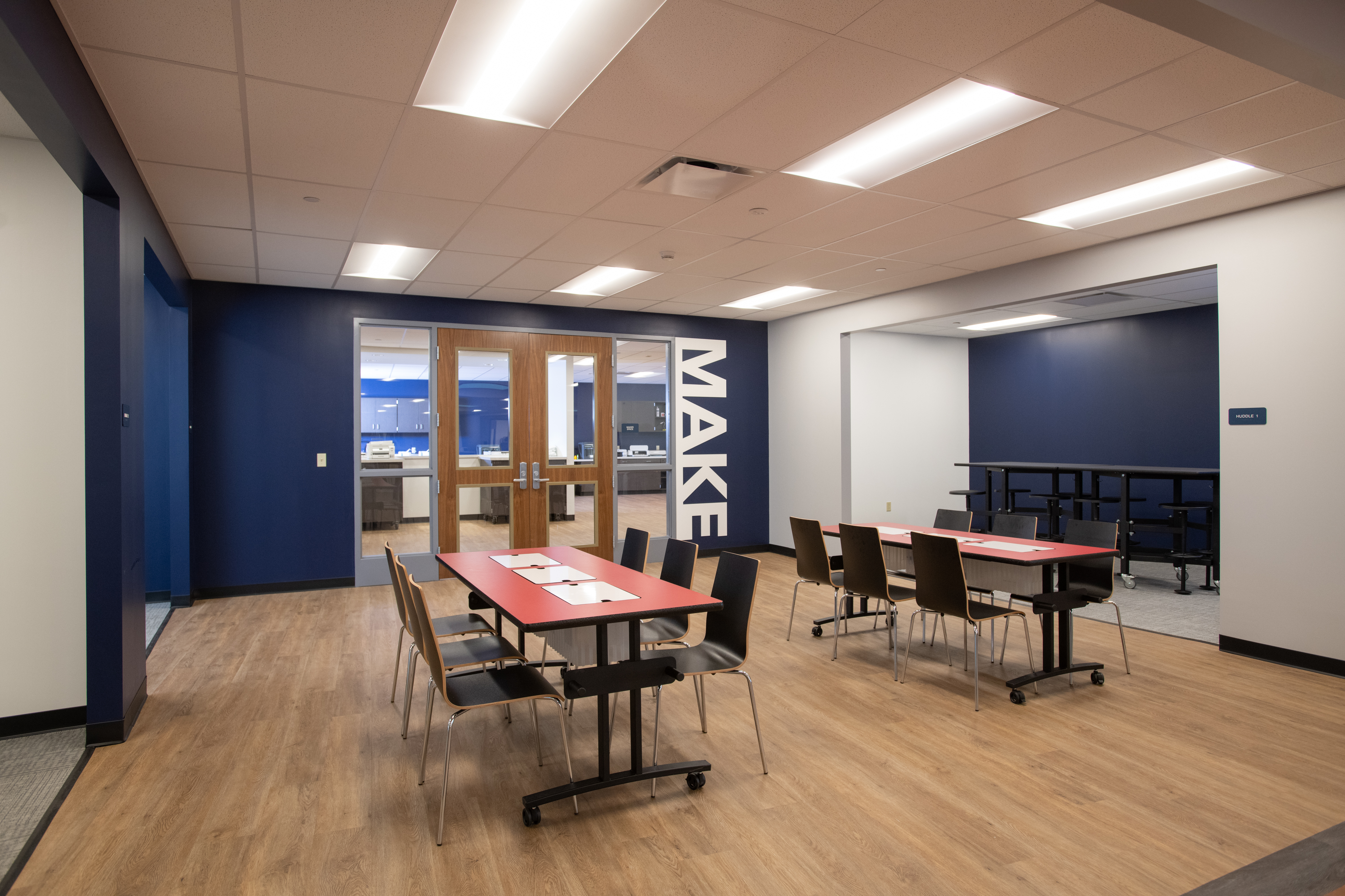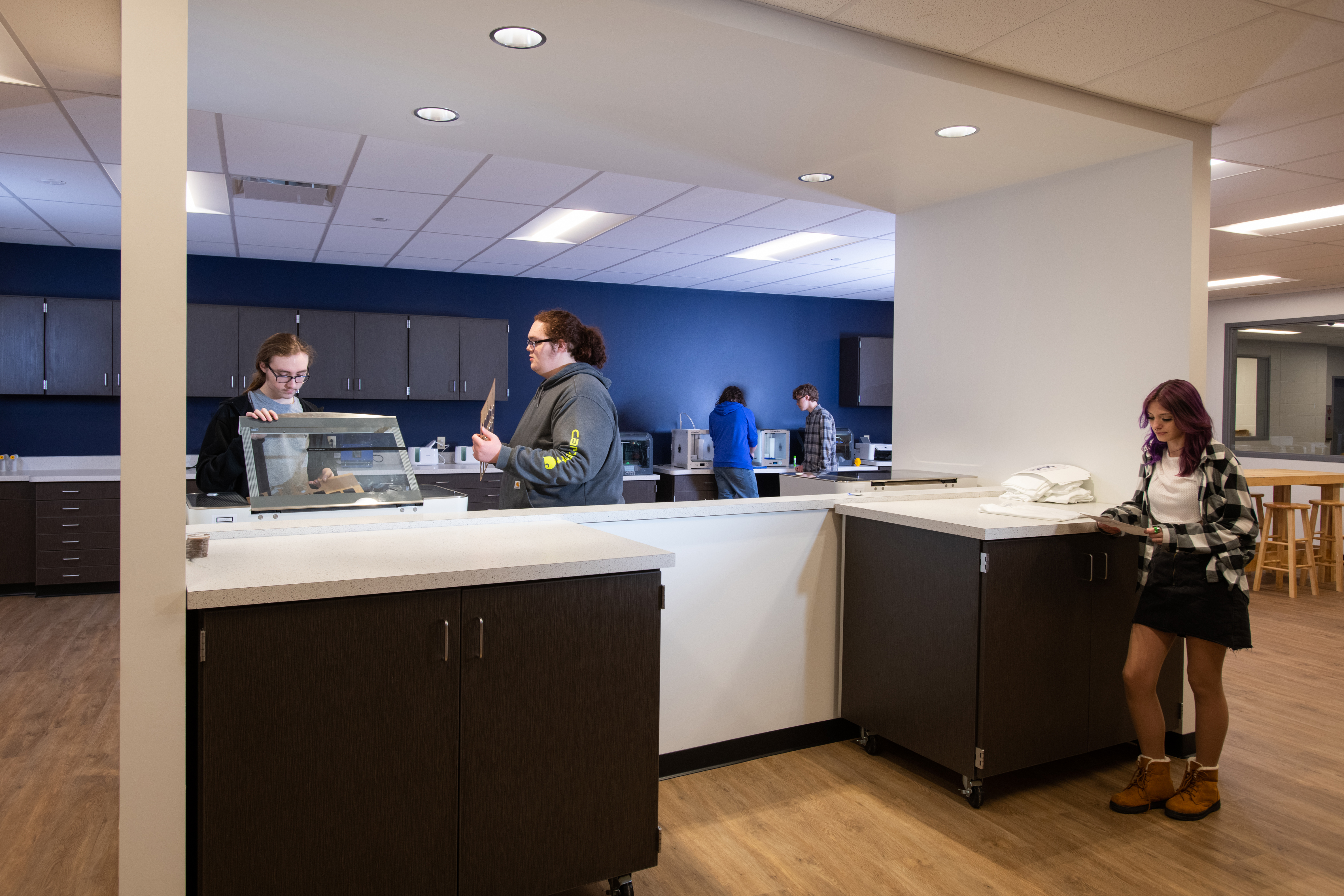An area of significant improvement was the original Library/Media Center; the renovated 13,000 SF area is now their Innovative Learning Center, where students are encouraged to be creative, collaborate, brainstorm, and create. It’s hands-on, immersive learning. This area includes an updated Maker Space, STEM Lab & Flexible / Group Learning Center that creates various small scale break out “Huddle Spaces” to encourage and facilitate independent and small group study, 3D printers, Crickets, laser printers, heat presses, whiteboard Kiva wall room for brainstorming and collaboration, multimedia greenroom, Presentation Space, and a student engagement conference room. There are VR capabilities with it, too, where students can walk around, visit different sites, and go on trips to other places.